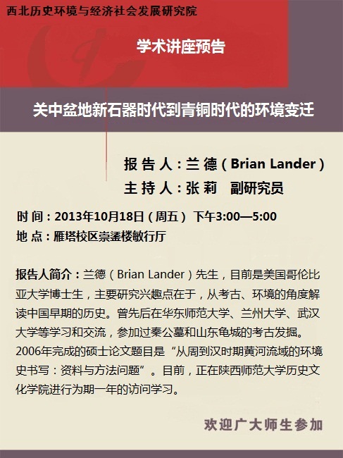 学术报告预报:关中盆地新石器时代到青铜时代的环境变迁