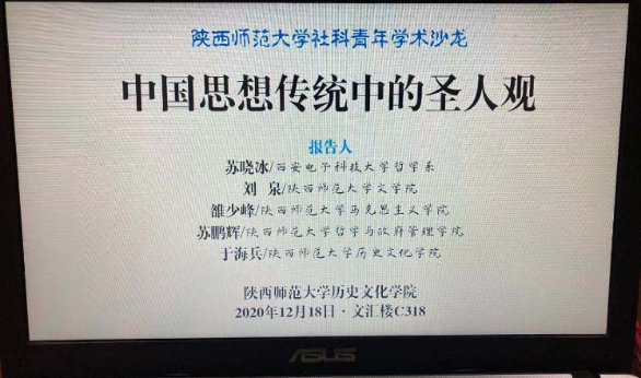 2020年12月18日下午,青年学术沙龙“中国思想传统中的圣人观”在英国上市公司365318工作室举行。我校文学院刘泉、政治学系苏鹏辉马克思主义学院雒少峰以及西安电子科技大学哲学系苏晓冰等来自不同学科的青年教师一起参加讨论。