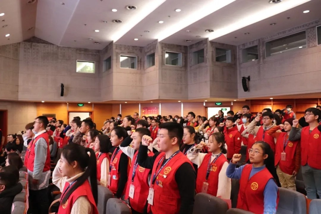 表彰结束后全体与会人员通过观看视频的方式共同见证了2021年志愿者工作协议书的签署。新一届志愿服务队队长代表在陕历博志愿委员会会长郭宁的带领下上台宣誓,我校提鸿畅同学作为新队长代表位列其中。